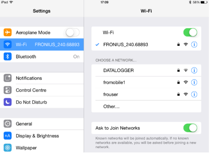 Search for the network with the name “Fronius_240.xxxxx” (the number you noted down earlier) on your device.