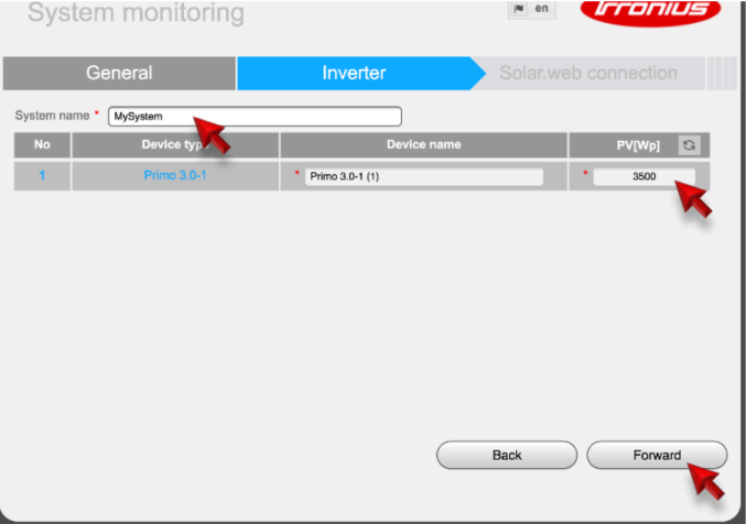 Check the device type and in the PV[Wp] field enter the size o your solar system. For a 6.6kw system the figure to enter is 6600, for an 8kw system, enter 8000.